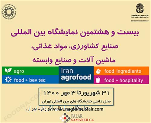 «بیست و هشتمین نمایشگاه بین المللی صنایع کشاورزی، مواد غذائی، ماشین آلات و صنایع وابسته - ایران آگروفود ۲۰۲۱» از تاریخ ۳۱ شهریور تا ۳ مهر ماه ۱۴۰۰ با رعایت کامل پروتکلهای اعلامی ستاد ملی کرونا در محل دائمی نمایشگاههای بینالمللی تهران برگزار میشود.