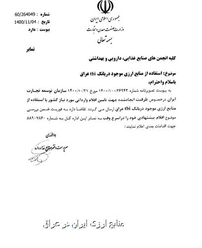 سرپرست دفتر صنایع غذا و داروی وزارت صنعت با ارسال نامهای به کلیه انجمنهای صنایع غذایی، دارویی و بهداشتی با اشاره به ظرفیتهای ایجادشده برای استفاده از منابع ارزی ایران در بانک TBI (Trade Bank of Iraq) عراق از آنها خواست که اقلام پیشنهادی وارداتی خود را با قید فوریت اعلام کنند.