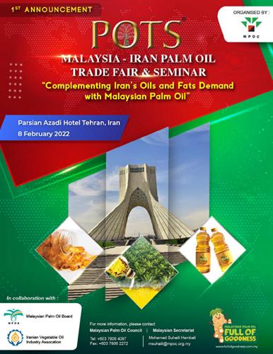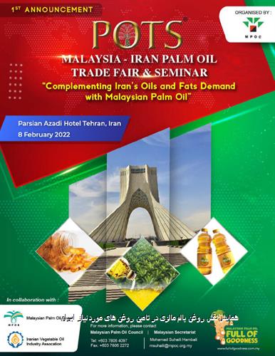 همایش «نقش روغن پالم مالزی در تامین روغن های مورد نیاز ایران» توسط شرکت های MPOB و MPOC مالزی و با همکاری انجمن صنفی صنایع روغن نباتی ایران و اتحادیه تولیدکنندگان و صادرکنندگان روغن نباتی ایران 19بهمن ماه در سالن زرین هتل پارسیان آزادی تهران و از ساعت 8:30 الی 16برگزار می شود.