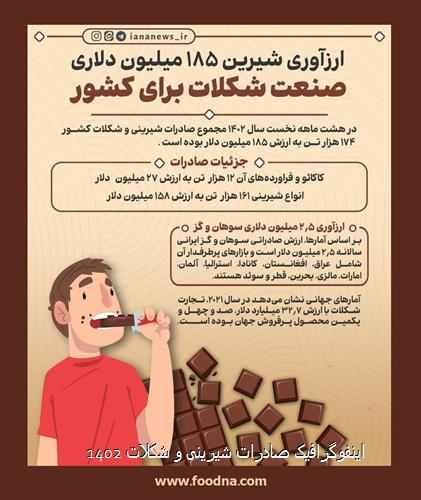 به گزارش آمارگمرک، این دوره مورد ارزیابی نشان میدهد که صادرات شیرینی و شکلات کشور ایران، با 174 هزار تنی محصول به ارزش 185 میلیون دلار، از جمله دستاوردهای مثبت این صنعت در بازارهای بینالمللی بوده است. از این میزان، 12 هزار و 383 تن مربوط به کاکائو و فرآوردههای آن به ارزش 27 میلیون و 338 هزار دلار و 161 هزار و 263 تن به ارزش 158 میلیون دلار مرتبط با انواع شیرینی بوده است.