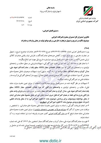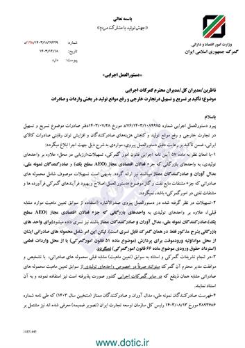 پیرو دستورالعمل اجرایی شماره ۷/۹۶/۱۴۰۳/۱۰۸۹۹۷۵ مورخ ۱۴۰۳/۰۷/۲۸ دفتر صادرات موضوع تسریع و تسهیل در تجارت خارجی و رفع موانع تولید و کاهش هزینههای صادرکنندگان و افزایش توان رقابتی صادرات کالای ایرانی، ضمن تاکید بر رعایت دقیق دستورالعمل پیروی، مواردی به شرح ذیل جهت اجرا ابلاغ میگردد: