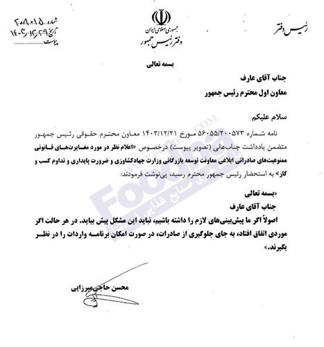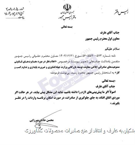 مسعود پزشکیان در پاسخ به یادداشتی از عارف، معاون اول رئیس جمهور، در خصوص تنظیم بازار محصولات کشاورزی، با انتقاد از رویکرد ممنوعیت صادرات، تصریح کرد که در صورت کمبود در بازار داخلی، به جای جلوگیری از صادرات، باید برنامه واردات را در نظر گرفت.