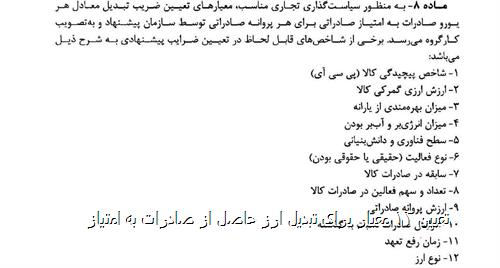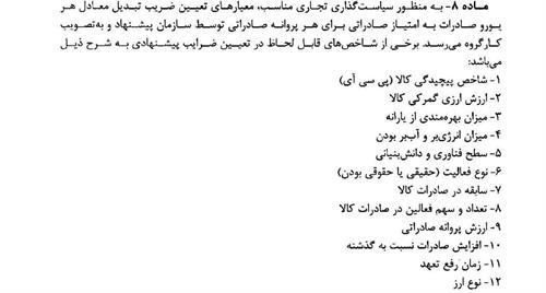 به گزارش پایگاه خبری صنایع غذایی فودنا، بر اساس ماده ۸، ضریب تبدیل ارز حاصل از صادرات هر گروه کالایی به امتیاز صادراتی، با توجه به شاخصهای زیر تعیین میشود: