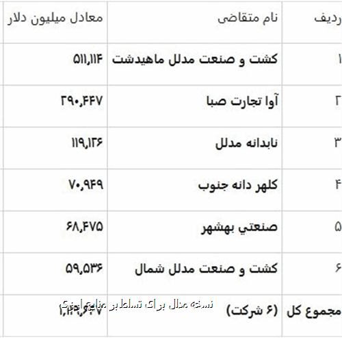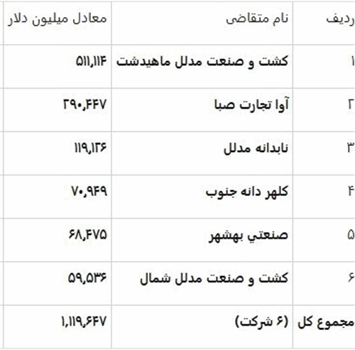 - کشت و صنعت مدلل شمال: ۵۹.۵۳۶ میلیون دلار