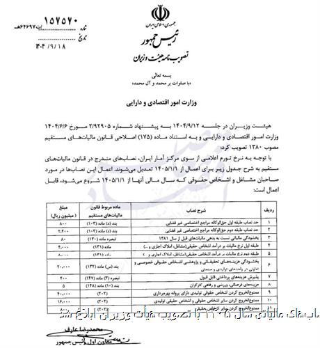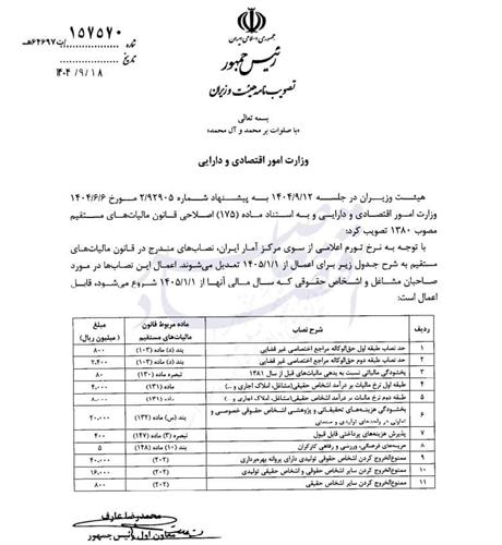 این مصوبه که به امضای محمدرضا عارف، رئیس سازمان برنامه و بودجه کشور رسیده، از ابتدای سال ۱۴۰۵ در تمامی بخشهای مالیاتی کشور لازمالاجراست و مبنای محاسبات ادارات مالیاتی قرار خواهد گرفت.