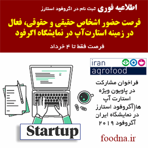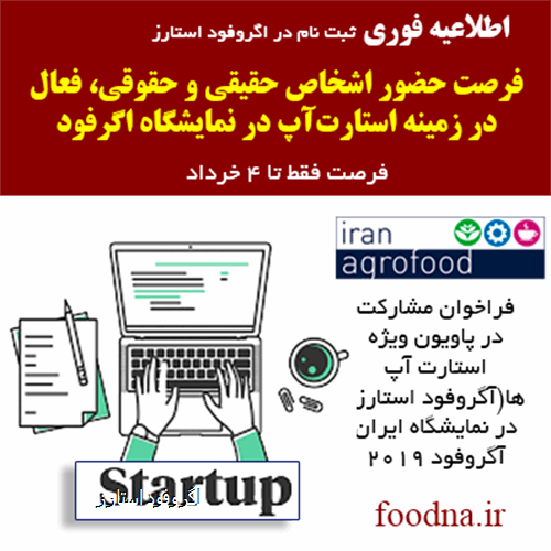 لذا بدین وسیله از استارت آپ های فعال به صورت حقیقی و حقوقی در این حوزه دعوت بعمل می آید، در صورت تمایل به حضور در بخش آگروفود استارز نمایشگاه ایران آگروفود 2019 با دانلود و تکمیل فرم قرار داده شده در لینک زیر و ارسال آن حداکثر تا تاریخ ۴ خرداد ۱۳۹۸ به آدرس ایمیل palarsamaneh@gmail.com آمادگی خود را جهت حضور در این نمایشگاه اعلام فرمایند.