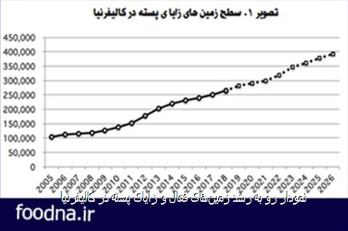 سطح زیر کشت پسته در آمریکا از 688 هکتار در سال 1977، به بیش از 72000 هکتار در سال 2012 رسید و تا امروز این افزایش ادامه دارد. سطح زمین های زایا در پایان سال 2026، بالغ بر 159000 هکتار خواهد بود. در تصویر 1، نمودار رو به رشد زمین های فعال و زایای پسته در کالیفرنیا را مشاهده می کنید.