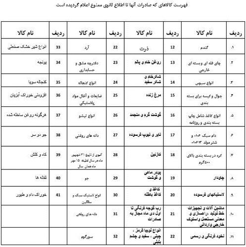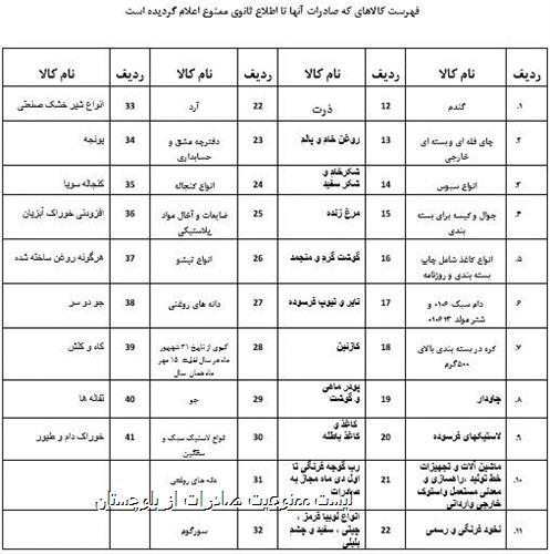 بر اساس اعلام گمرک جمهوری اسلامی ایران، صادرات ۴۱ قلم کالا از استان سیستان و بلوچستان تا اطلاع ثانوی ممنوع شده است.